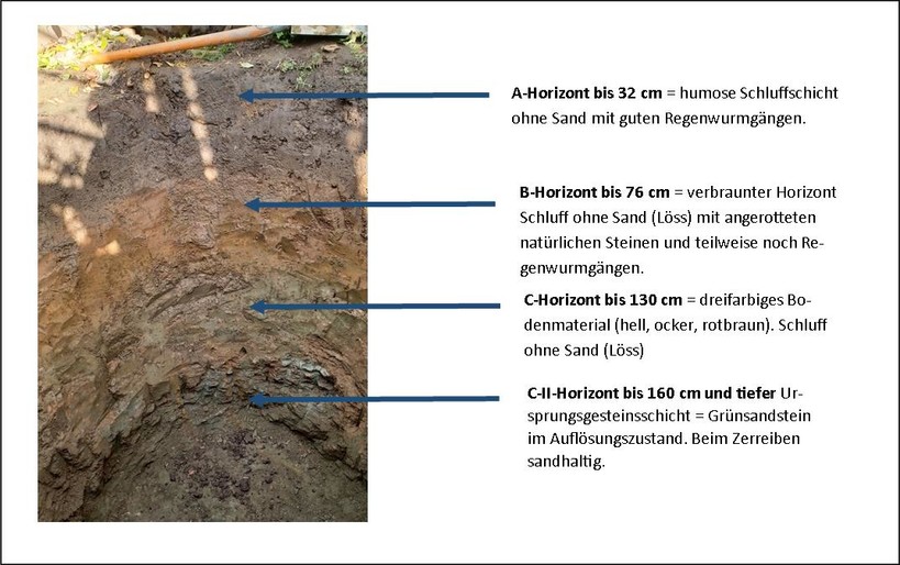 Die unterschiedlichen Bodenhorizonte und der ausgehobene Boden zeigten keine sichtbaren Altlasten, sondern bieten insgesamt eine gute und lange Wasserhaltefähigkeit, da sie auch nach einigen trockenen Tagen noch eine gute Bodenfeuchtigkeit aufweisen. Die humosen oberen Schichten haben bedingt durch ihre vielen sichtbaren unterschiedlich großen Luftporen (Regenwurmtätigkeiten) eine gute Wasseraufnahme und Wasserhaltefähigkeit. Auch die darunterliegenden Horizonte haben eine gute Wasserhaltefähigkeit.
