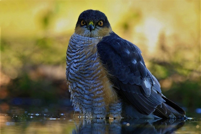 Nebenbei bemerkt: Über und in unserem vogelfreundlich gestalteten Garten mit Zufütterung zeigt sich seit ein paar Jahren der sogenannte Sprinz ( männl.Sperber ) vom nahen Wald fast täglich. Manchmal sitzt er kurz nach Sonnenaufgang versteckt wartend auf einem alten Baumstumpf. Oder seine Anwesenheit zeugen Restfedern ( Rupfe ) von einem typischen Gartenvogel, den er als Beute geschlagen hat. An heißen Sommertagen nimmt er sogar in der Flachwasserzone des Gartenteichs kurz ein Bad oder trinkt.