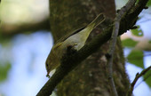 Phylloscopus-Laubsänger Typ Fitis/Zilpzalp in ca. 8 m Höhe; von schräg unten gesehen; sehr helle, fast weiße Unterseite, dunkle Beine, keine Flügelbinden. Prominenter weißlicher Überaugenstreif, schwarzer Augenstreif, gelber Steiß. Auf den direkt gemachten Fotos ist deutlich ein gelber Bereich im Überaugenstreif vor und über dem Auge zu erkennen.
